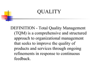 Toyota has built a foundation for total quality management through innovation, ethics and trust. They empower employees and encourage open communication to deliver what customers expect. Leading technology helps detect defects early and provide better solutions. Top management inspires values that guide subordinates to sustain a unique, difficult-to-imitate competitive advantage in innovation linked to superior technology and continuous improvement.