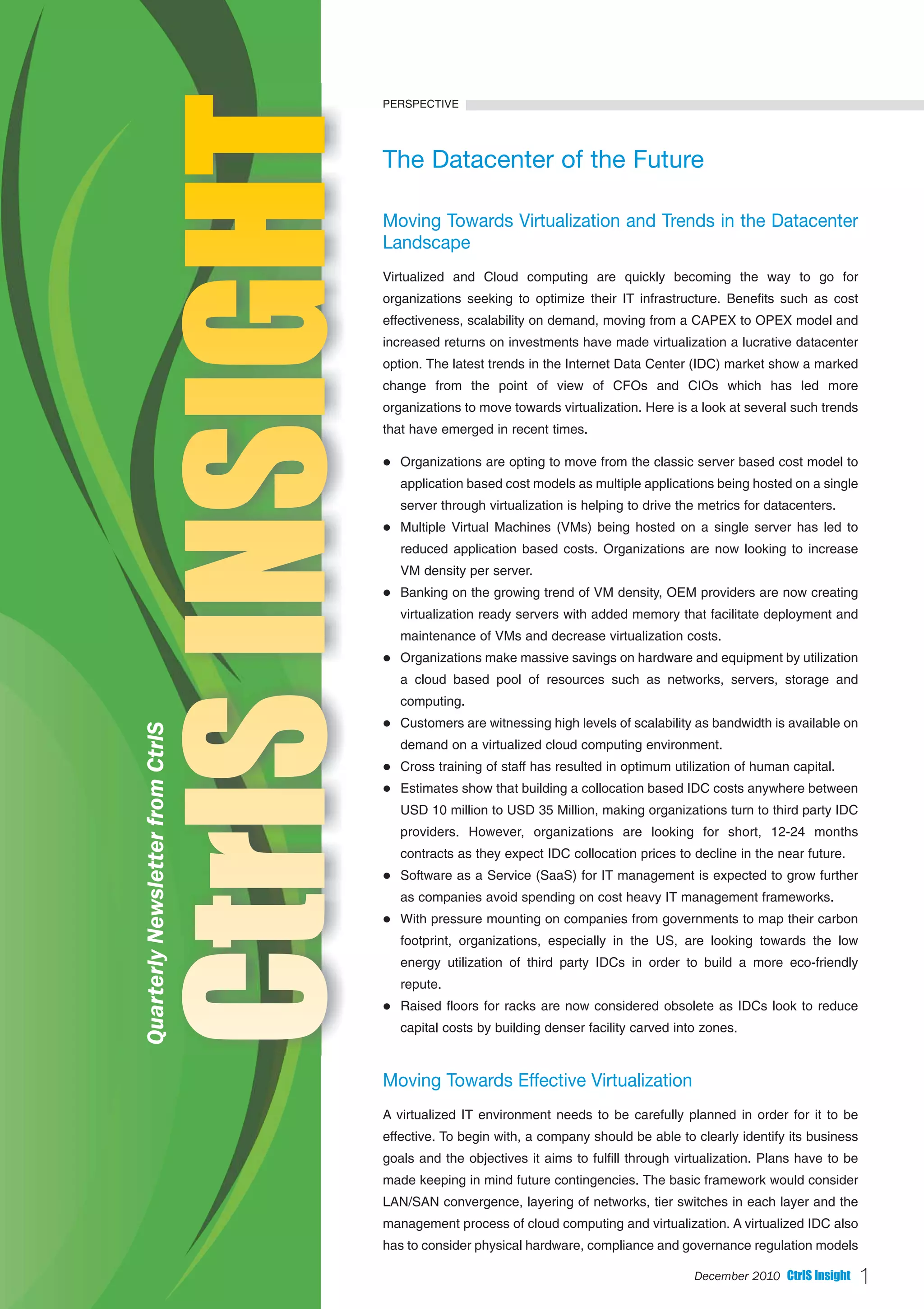 The document discusses the transition of datacenters towards virtualization and cloud computing, highlighting benefits such as cost savings, scalability, and increased efficiency for organizations. It outlines several trends in the Internet Data Center (IDC) market, emphasizing the shift from traditional server-based models to application-based costs and the growing use of third-party IDC providers due to expenses associated with building and maintaining in-house datacenters. Additionally, the document illustrates the importance of strategic planning and effective management in the implementation of virtualized environments to ensure alignment with business goals.