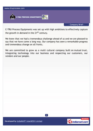 C-Tru Process Equipments, established in 1972, specializes in manufacturing and exporting industrial components such as sight flow indicators, strainers, and level gauges. The company emphasizes growth through multicultural integration and technological advancement, aiming to meet increasing demand. Headquartered in Mumbai, they cater primarily to the Indian subcontinent with a diverse product range.