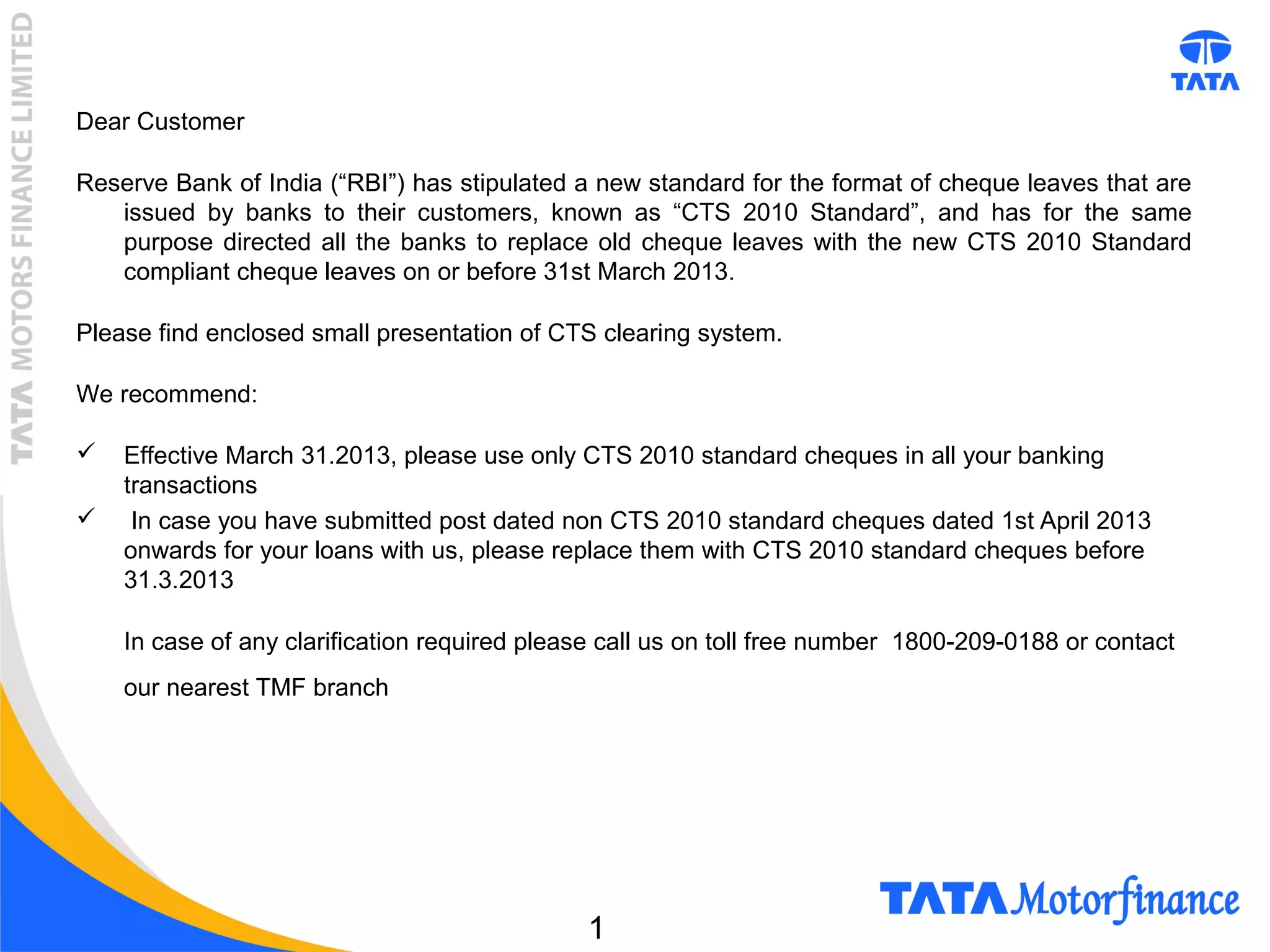 The Reserve Bank of India has mandated that all banks must replace old cheque leaves with new CTS 2010 Standard compliant cheque leaves by March 31, 2013. The letter recommends that customers use only CTS 2010 standard cheques for all banking transactions after this date and replace any post-dated non-compliant cheques with CTS cheques before the deadline. It also provides a small presentation explaining the key features of CTS cheques to help identify compliance.