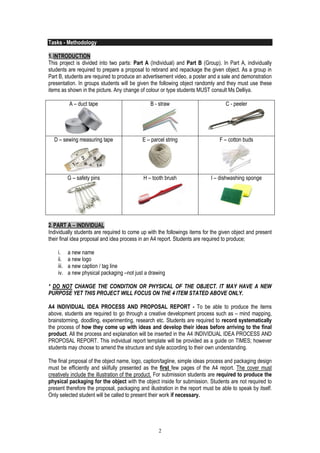 1) Individual work to rebrand an object with a new name, logo, tagline, and packaging design. Students submit a proposal and the physical packaging.