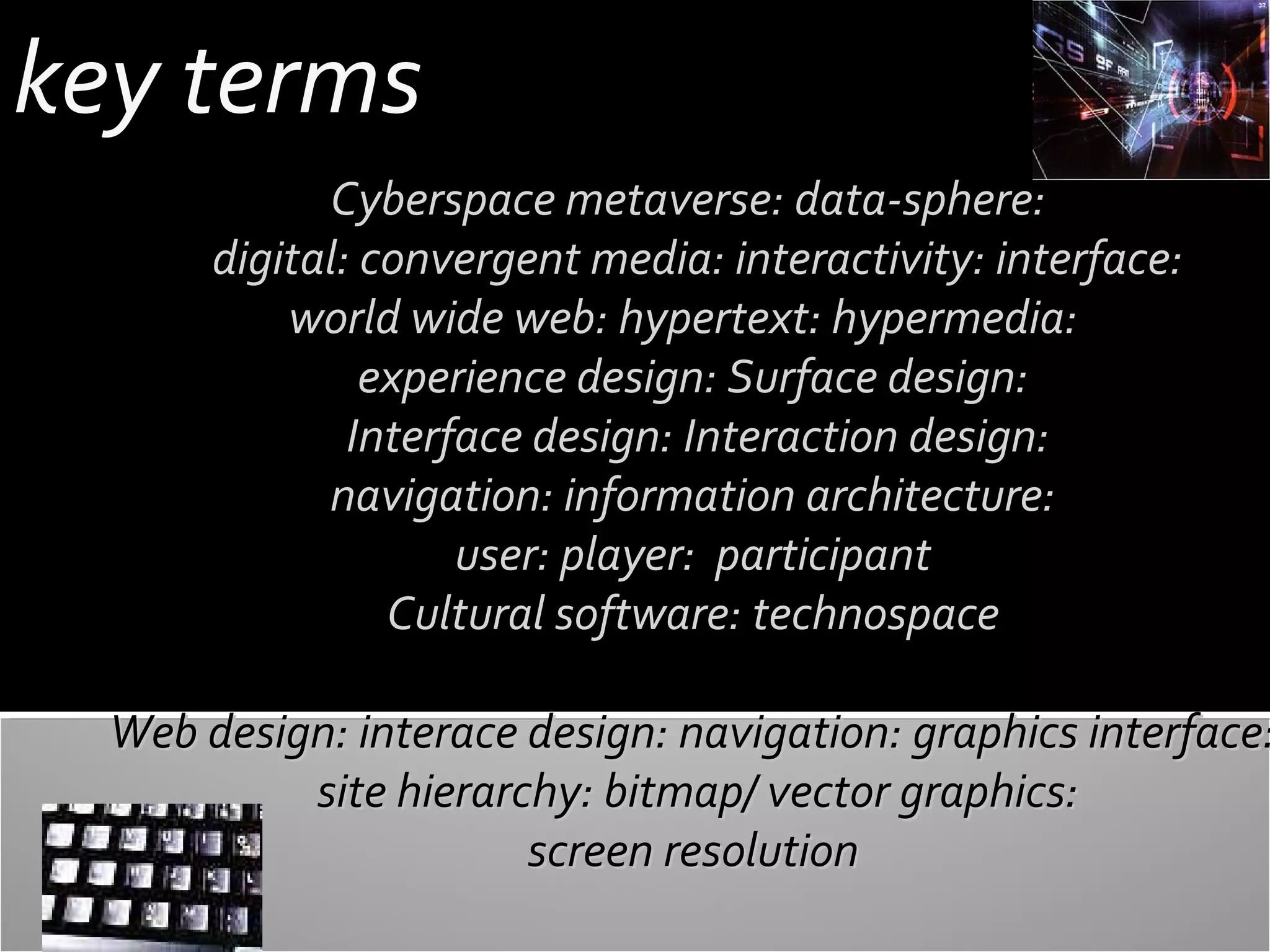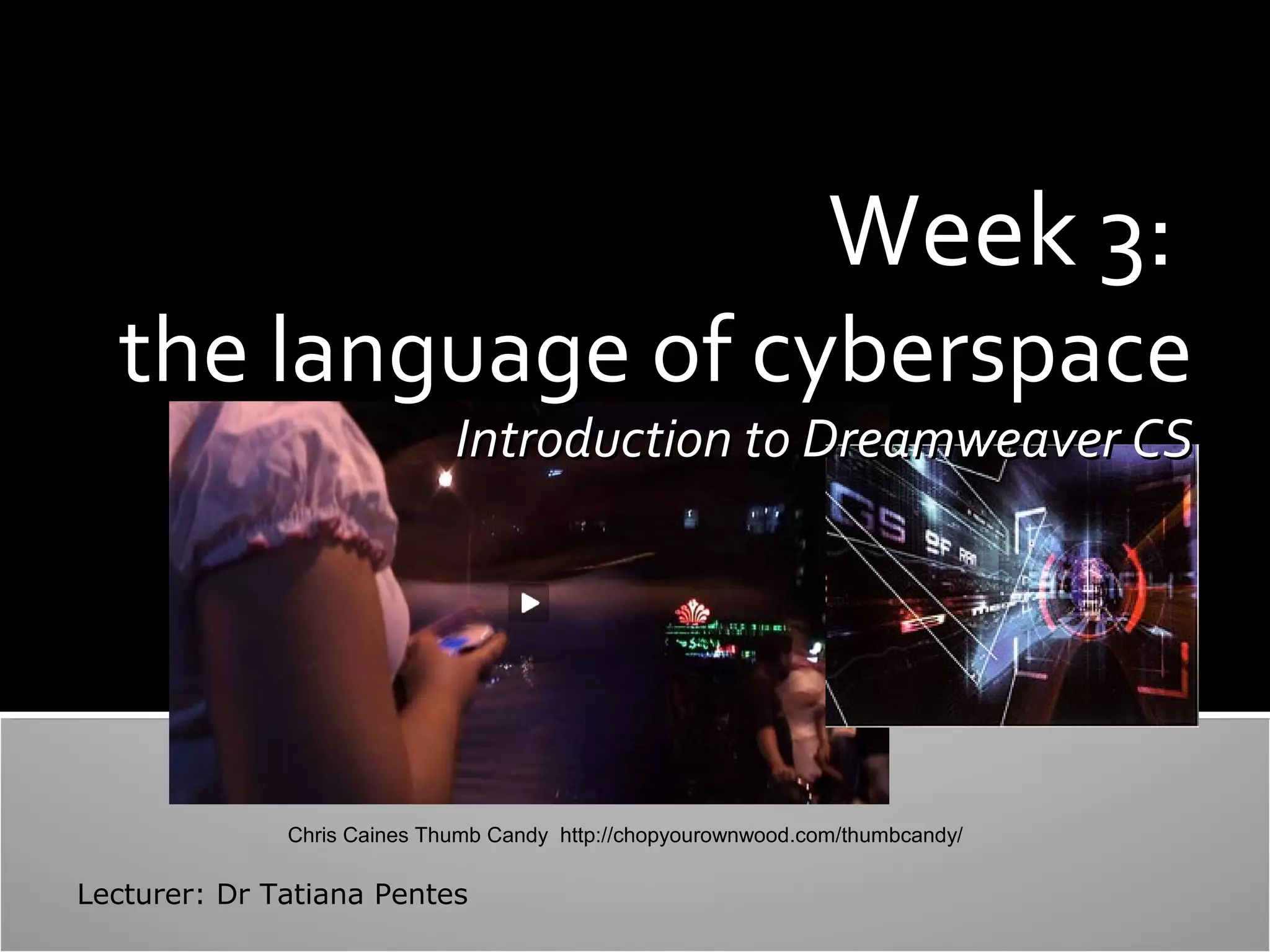 The document discusses the concepts of cyberspace and the language of new media, highlighting key terms such as cultural software, interactivity, and interface design. It outlines a creative assessment task using Dreamweaver CS, requiring students to develop an individual website that interprets a photograph. The curriculum emphasizes the importance of user experience design, addressing both content structure and interactive elements in web development.