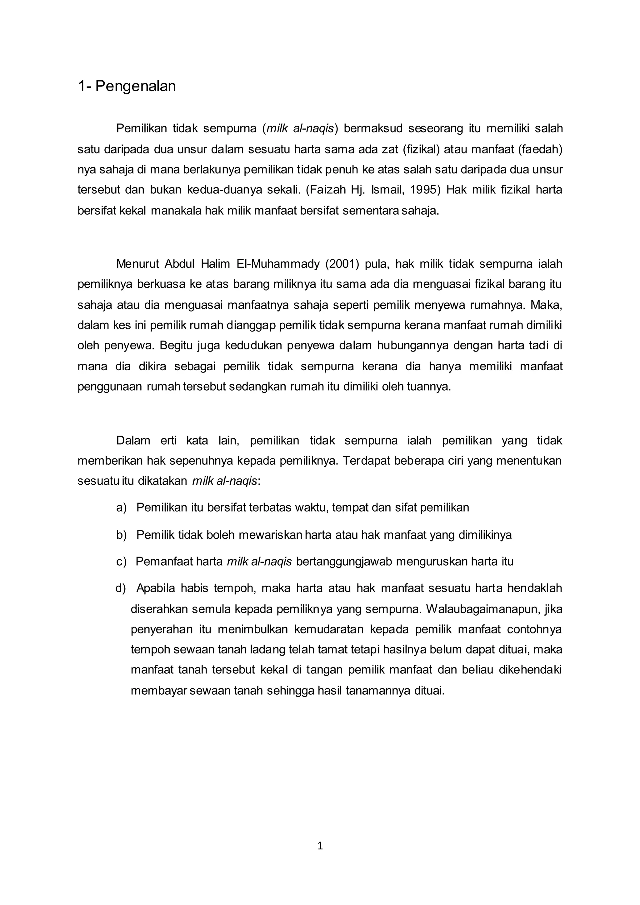 Teks tersebut membahas tentang konsep pemilikan tidak sempurna dalam hukum Islam. Terdapat tiga jenis pemilikan tidak sempurna yang dijelaskan yaitu pemilikan harta saja, pemilikan manfaat peribadi, dan pemilikan manfaat bersama. Pemilikan tidak sempurna berarti pemilik hanya memiliki sebagian dari dua unsur kepemilikan yaitu zat (fisik) atau manfaat dari suatu harta.