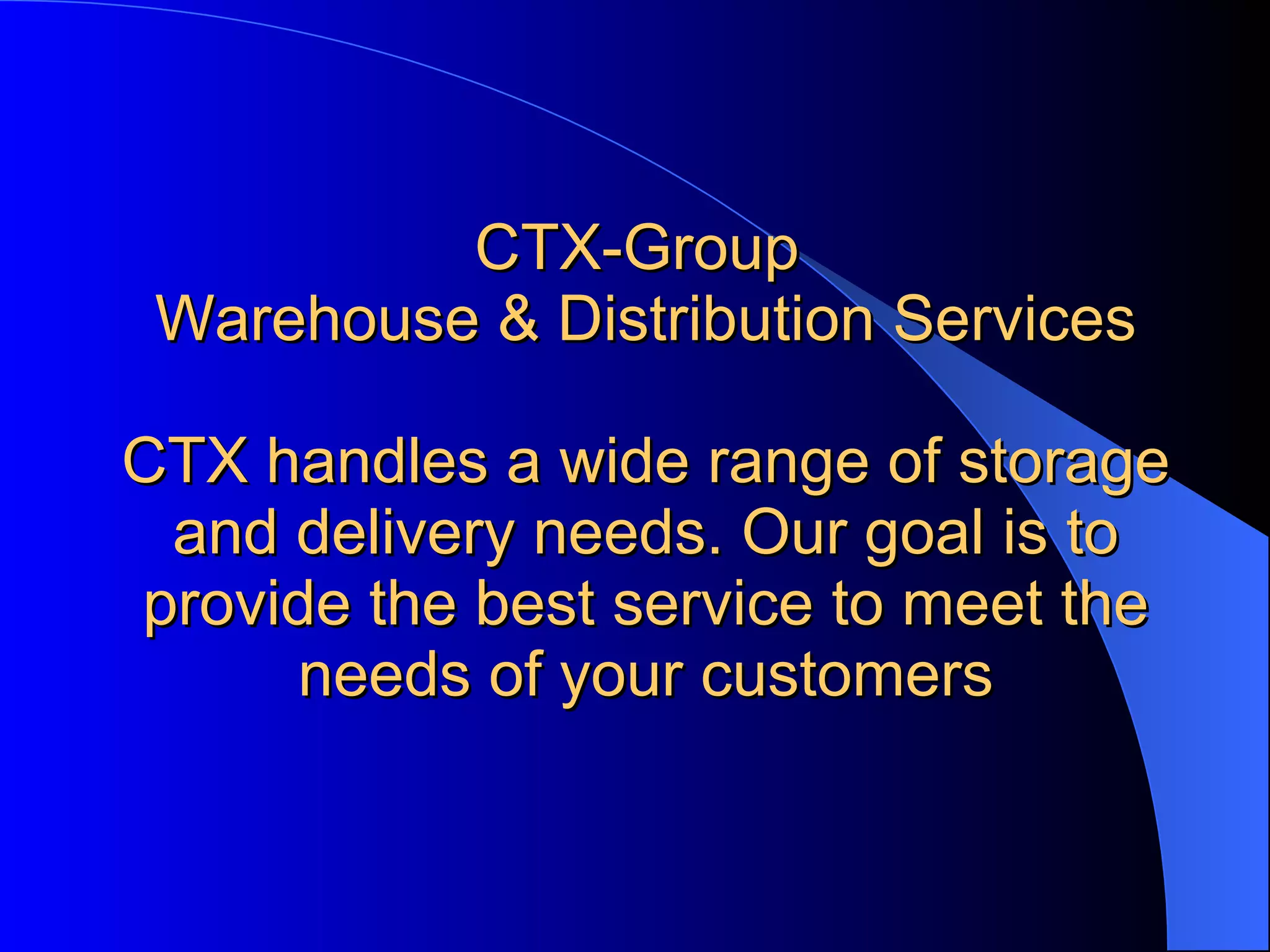CTX Group is a family-owned transportation and warehousing company with over 75 years of experience. They provide a wide range of storage, distribution, and delivery services out of their network of warehouses located along the Northeast corridor and surrounding areas. Their services include container drayage, order fulfillment, consolidation, and asset-based trucking and LTL services throughout North America. They aim to provide customized logistics solutions and the highest level of service to meet customers' needs.
