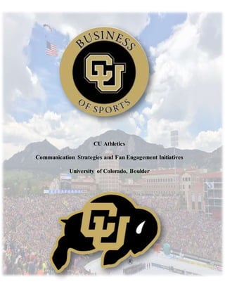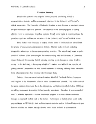 The document provides an overview of research conducted by the University of Colorado's athletic department to identify effective communication strategies and fan engagement initiatives to increase attendance. It conducted surveys and focus groups of CU students to understand which social media platforms and messaging resonate best. The research found that Facebook, Twitter, Instagram and Snapchat were preferred communication channels for students. Creating a sense of community through a student ambassador program and student-led social media was recommended to better connect students with athletes and encourage attendance.