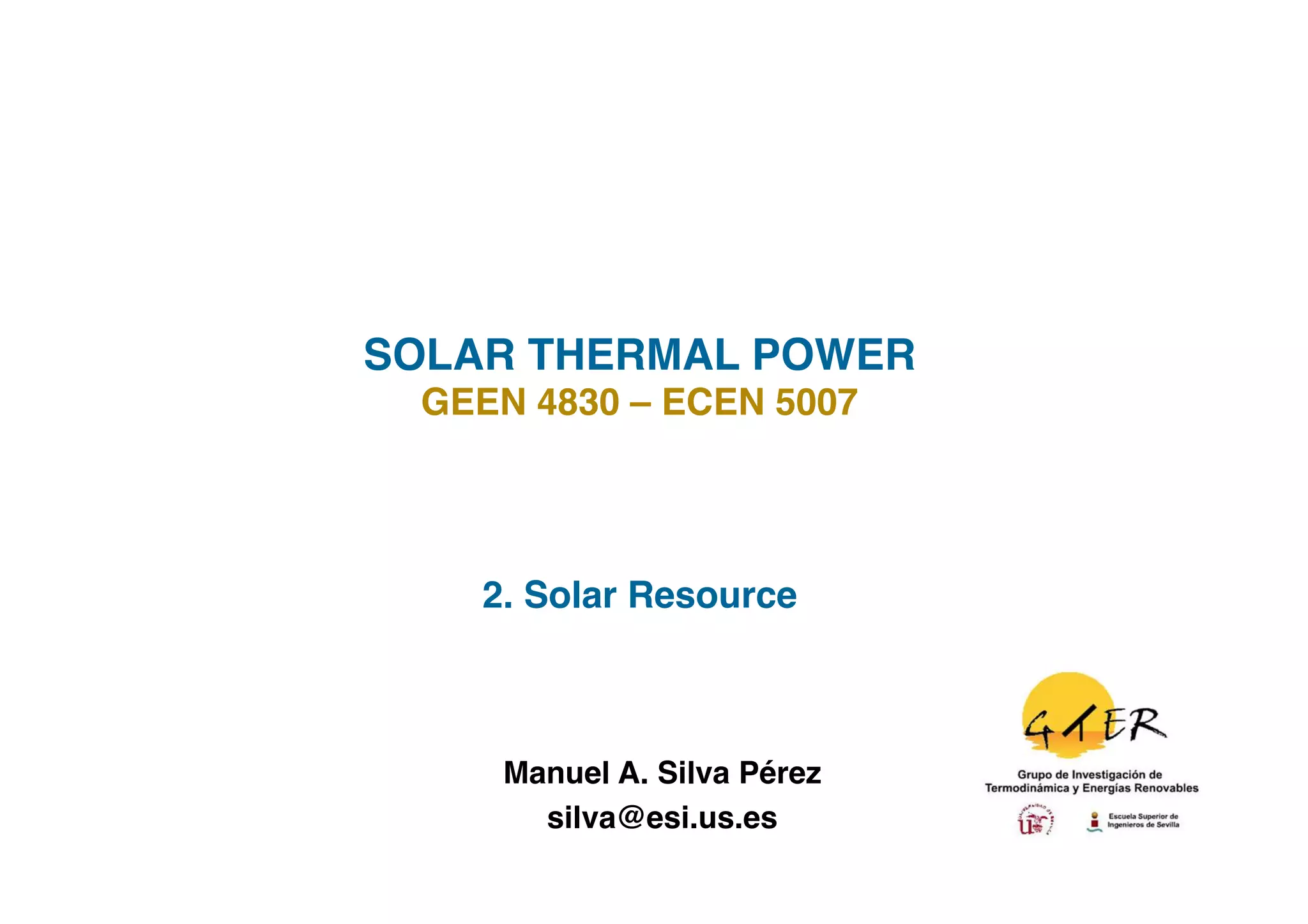 2. It describes the solar resource and measurements of solar radiation, including quality control of data and methods to estimate radiation values.