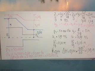 - The document contains examples of calculating head loss and pressure differences in pipes due to changes in diameter or flow rate.
