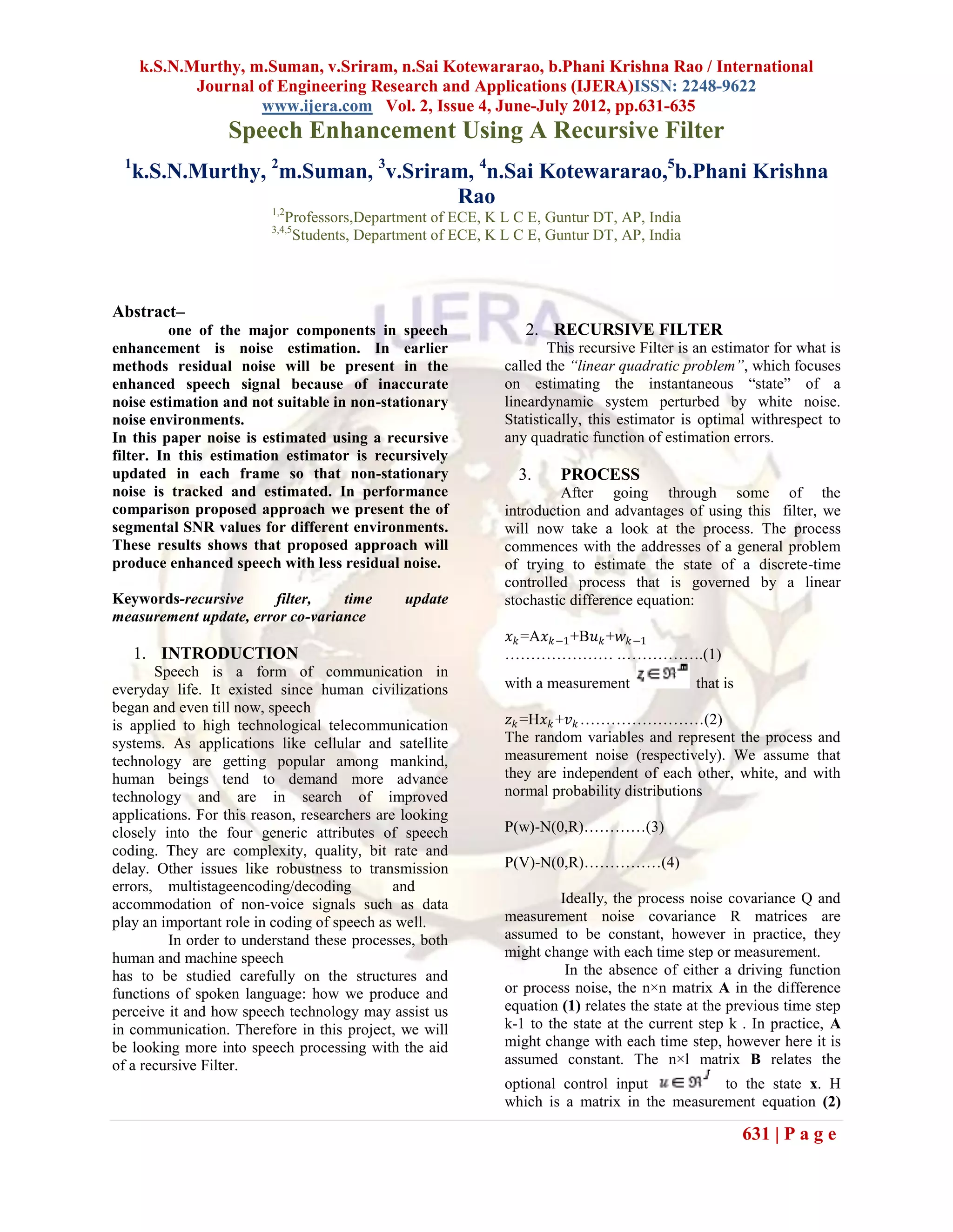The document discusses speech enhancement using a recursive filter. It begins by introducing speech processing and the need for enhancement. [1] It then provides an overview of the recursive filter, which estimates the state of a dynamic system perturbed by noise. [2] The document outlines the process, which involves expressing speech as a state space model and applying the recursive filter equations in a loop. [3] This involves predicting the state ahead and correcting it using measurements to iteratively estimate speech signals with less residual noise.