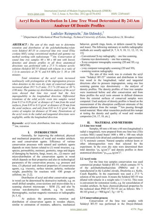 The document summarizes a study that used gamma ray densitometry to determine the distribution of acryl resin in lime tree wood samples after pressure impregnation. The samples were impregnated for 5, 30, or 180 minutes and density profiles were measured before and after impregnation. Total resin retention increased nonlinearly with impregnation time. Resin penetration was best in the longitudinal direction, with differential retention ranging from 0.15-0.20 g/cm3 near the surface to 0.02-0.11 g/cm3 in the center. Penetration in the radial and tangential directions was negligible compared to the longitudinal direction. The study demonstrated gamma ray densitometry can be used to