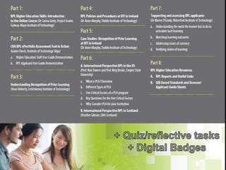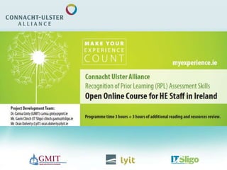 The document outlines a collaborative initiative in Ireland focused on recognizing prior learning (RPL) through an e-portfolio assessment tool and an open online course for higher education staff. It highlights the low participation rates in lifelong learning in Ireland and addresses the challenges, such as lack of awareness and knowledge regarding RPL opportunities. The project aims to align with national and EU policies to enhance access to qualifications and support lifelong learning.
