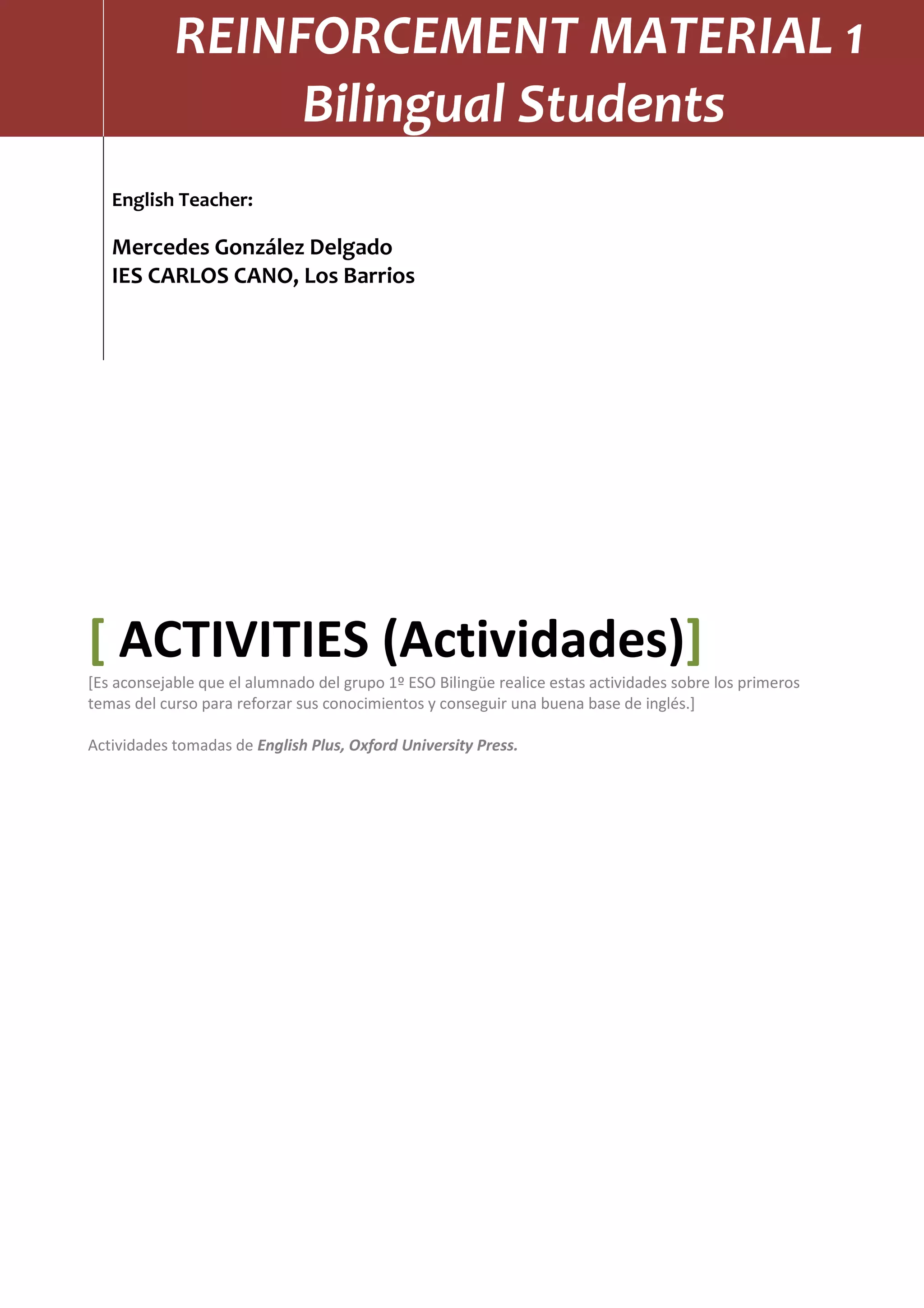 This document contains activities for bilingual students to reinforce their English knowledge on various grammar topics. The activities include exercises on possessive 's, subject pronouns, possessive adjectives, be verbs, have got, demonstrative pronouns, prepositions, present simple verbs, and subject/object pronouns. Students are asked to complete sentences, questions, tables, and short dialogues related to the grammar points. The purpose is for students to practice and strengthen their understanding of basic English grammar.