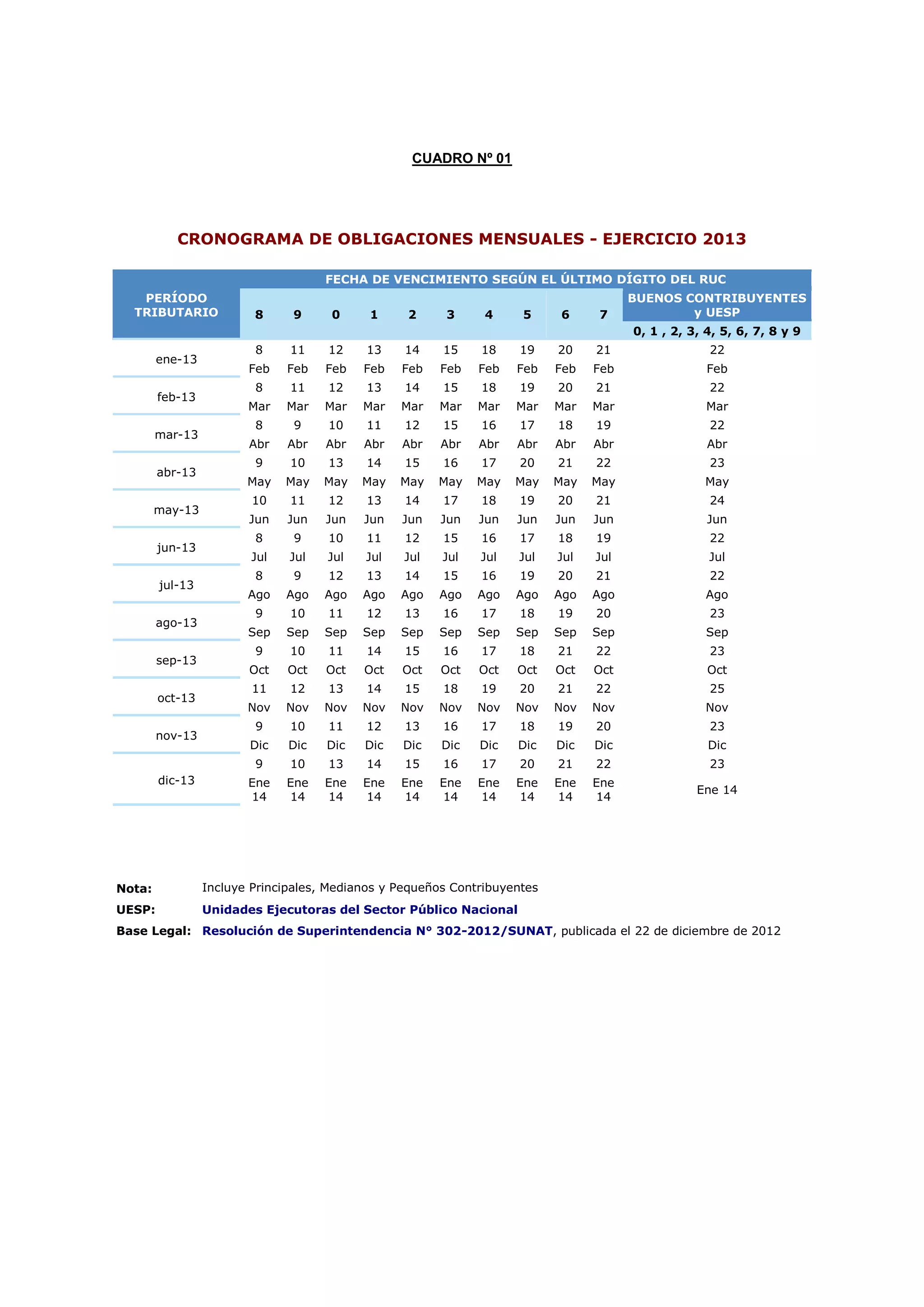 The document is a chronogram of monthly obligations for the 2013 fiscal year in Peru. It shows the due dates for tax payments according to the last digit of taxpayers' tax identification numbers (RUC). Due dates vary each month, from the 8th to the 22nd typically, with some exceptions. It also notes that good taxpayers and public sector entities have until the 22nd or 23rd to pay depending on the month.