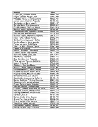 This document contains a list of 30 names along with their corresponding identification numbers, or cedulas. It includes names like Andrea Carolina Quero Leal, Abygail Jireh Magrini Estrada, and Luciana Andreina Villalobos Hayek along with their identification numbers 18.664.503, 20.692.029, and 18.823.781 respectively.