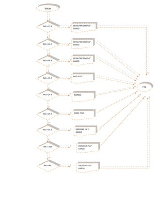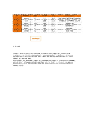 This document contains a table with 6 entries listing people's names, weights, heights, BMIs, and observed conditions. It also includes a formula to classify BMI into categories like normal, overweight, obese grades 1-3, and underweight grades 1-3 based on BMI ranges.