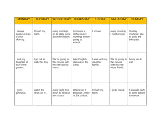 The document outlines a typical weekly schedule, including daily activities like waking up at 6am, brushing teeth, showering, going to study sessions at 7am, reading before bed, and going to sleep at 10pm. Weekend activities involve going to the bike path on Sundays, picking up his daughter from the garden on Fridays, and going to the movies or to eat with friends and family.