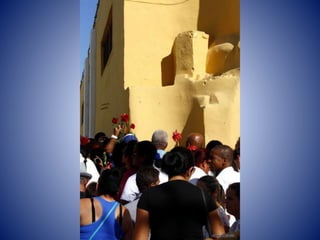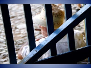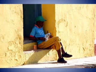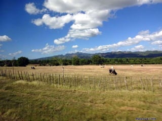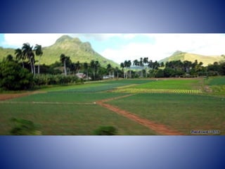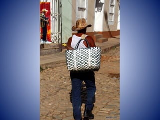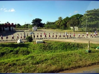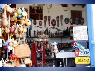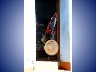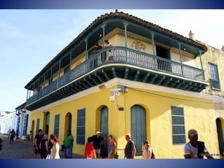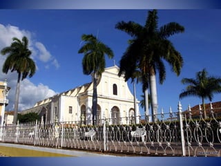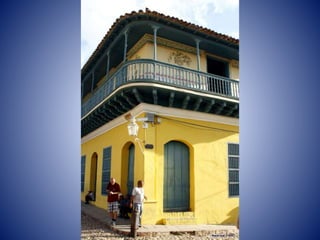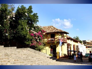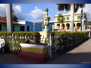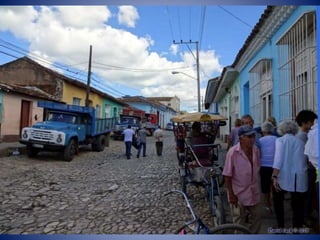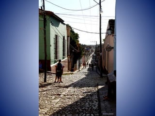 Trinidad, Cuba is a historic town founded in 1518 that was designated a UNESCO World Heritage Site for its well-preserved colonial architecture. It is located in a scenic valley known as Valley de los Ingenios that was once home to numerous sugar plantations. The document provides information about traveling to Trinidad from Camagüey, mentions free range chicken production, and notes that an internet time card is required to access the internet and the local library contains photographs.