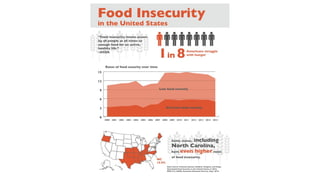 This document provides an overview of creating infographics from data. It discusses finding relevant data from government, commercial, think tank and hybrid sources. It also covers best practices for exploring data to find patterns and stories, visualizing data in infographics, and critiquing infographics. The workshop teaches how to plan infographics based on data about food insecurity in the US and sketch an example infographic on this topic. Resources for creating and finding inspiration for infographics are also listed.
