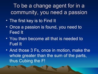 1) The document discusses how to become an agent for change in your community by following three steps: Find a passion, Feed your passion by learning more about it, and Fuel your passion by taking action as an advocate or champion.