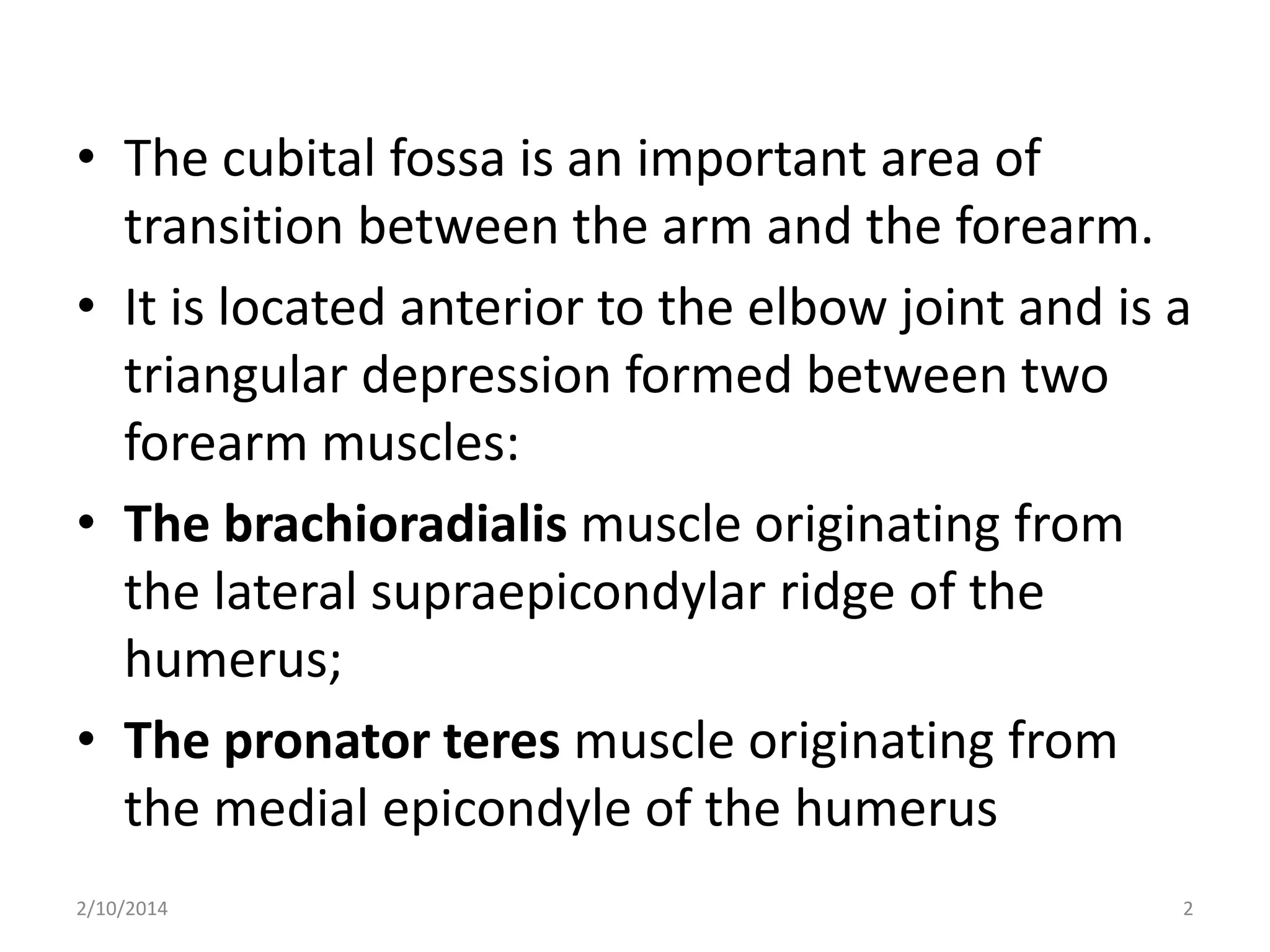 The cubital fossa is a triangular depression located on the anterior side of the elbow. It is bounded by the brachioradialis muscle laterally, the pronator teres muscle medially, and an imaginary line connecting the medial and lateral epicondyles superiorly. The floor is formed by the brachialis muscle. The main contents of the cubital fossa are the biceps brachii tendon laterally, the brachial artery in the middle, and the median nerve medially. The brachial artery often bifurcates into the radial and ulnar arteries within the cubital fossa. The median nerve passes deep between the two heads of the pronator teres muscle when