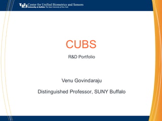The document summarizes the research capabilities and projects of the Cognitive Ubiquitous Computing Systems (CUBS) lab at SUNY Buffalo, led by Distinguished Professor Venu Govindaraju. The lab has strengths in multiple disciplines relevant to biometrics, document analysis, and security. It has a strong track record of technology transfer to industry partners and government sponsors such as the US Postal Service. Current research projects include biometric identification, document recognition, and enhancing security through techniques such as soft biometrics and detecting human versus synthetic inputs. The lab also has over 10 current PhD students and has graduated over 20 PhD alumni.
