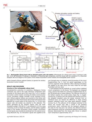The document discusses the integration of an ultrasoft organic solar cell into cyborg insects, specifically the Madagascar hissing cockroach, to enhance their mobility and power wireless locomotion control. This design achieves a notable power output of 17.2 mW while maintaining the insects' ability to perform key movements like traversing and self-righting. The innovative combination of lightweight materials and an adhesive–nonadhesive structure allows for effective energy harvesting without compromising the insects' basic motion capabilities.