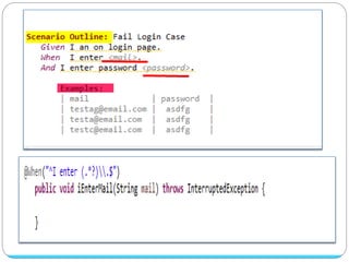 Cucumber is a tool that supports behavior-driven development (BDD). It allows test cases to be written in a simple language called Gherkin that both programmers and non-programmers can understand. Gherkin features are made up of scenarios with steps using keywords like "Given", "When", and "Then" to describe preconditions, actions, and expected outcomes. Cucumber supports many programming languages and can integrate with frameworks like Selenium for browser automation.