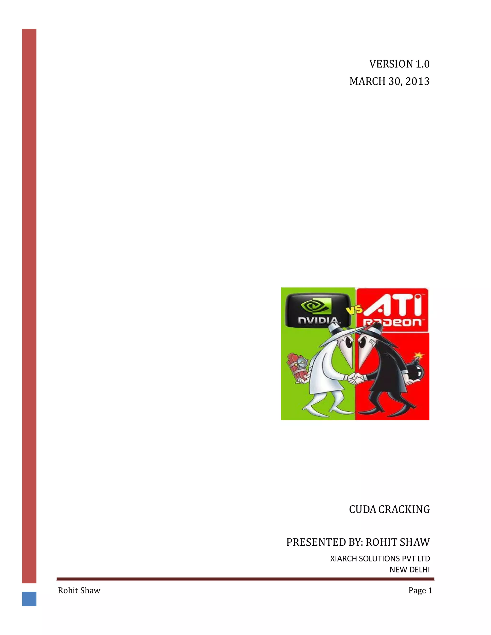 This document discusses using graphics processing units (GPUs) to crack passwords through CUDA cracking. It provides instructions on building a CUDA machine with multiple GPUs, selecting GPUs with many CUDA cores for best performance, and describes several password cracking tools that support GPU acceleration on Windows and Linux operating systems. Examples are given demonstrating that GPU cracking can crack a simple MD5 hash hundreds of times faster than CPU-only cracking.