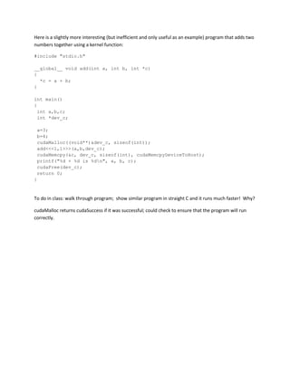 The document provides examples of simple CUDA programs for adding vectors and 2D arrays using kernel functions. It begins with a "Hello World" CUDA program and explains how to compile and run it. It then shows a CUDA program that adds two numbers in a kernel function using thread indexing. Next, it presents a CUDA program for adding two vectors with one thread per element. Finally, it demonstrates how to map a 2D array to linear memory and write a kernel to add 2D arrays using block indexing.