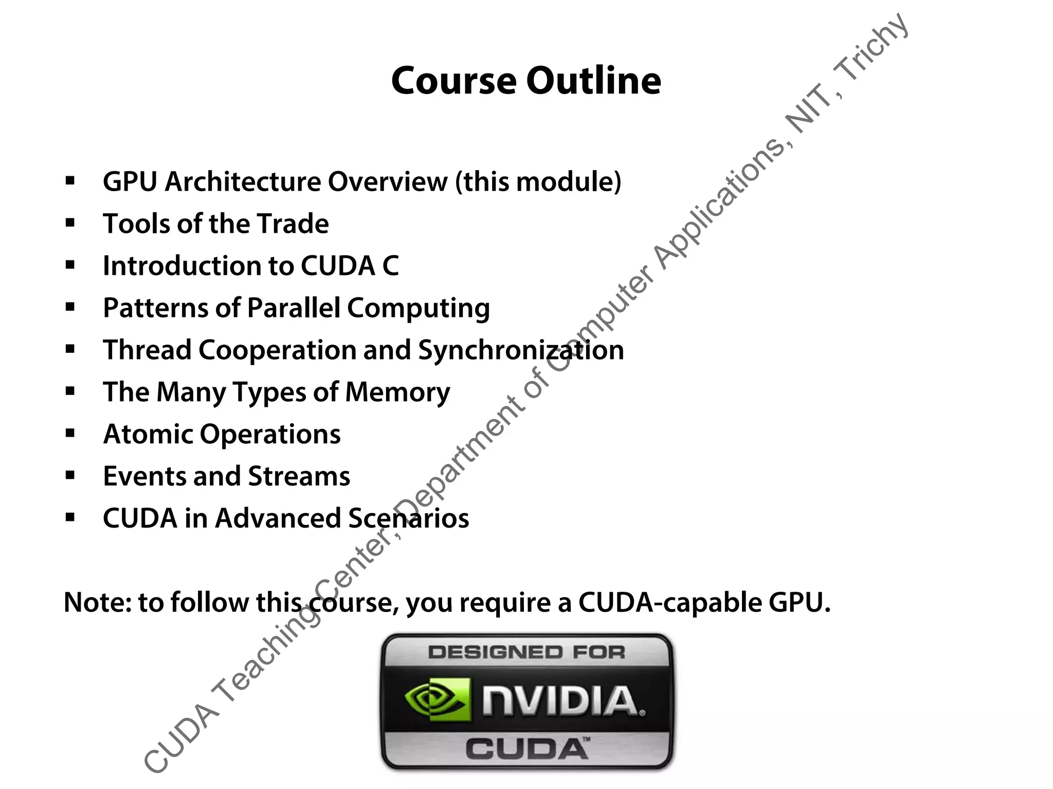 The document outlines a course on GPU architecture and CUDA programming. It covers GPU architecture overview, CUDA tools, CUDA C introduction, parallel computing patterns, thread cooperation and synchronization, memory types, atomic operations, events and streams, and advanced CUDA scenarios. Programming GPUs requires a CUDA capable GPU.