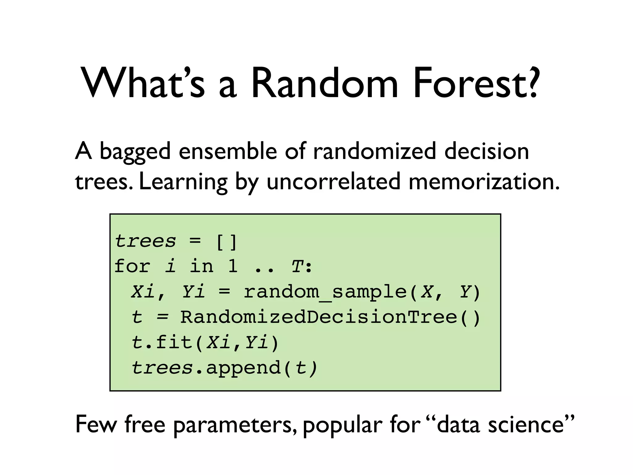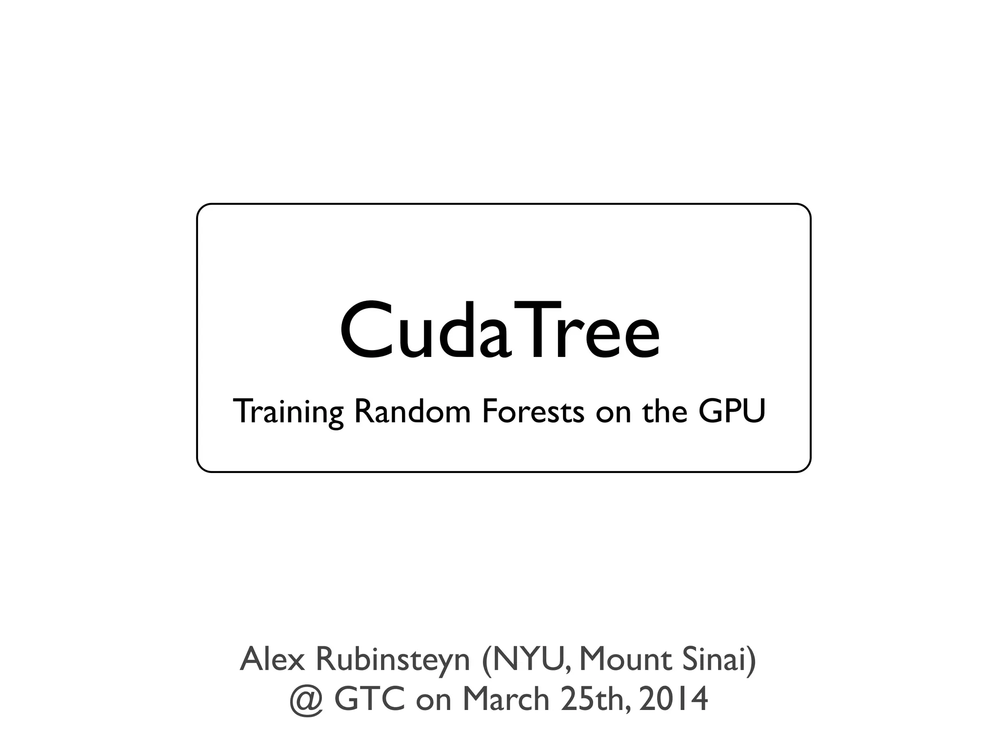 The document discusses the training of random forests on GPUs, highlighting the parallelization strategies for decision tree training, including depth-first and breadth-first approaches. It provides a comparative performance analysis of various GPU algorithms against the sklearn benchmark across multiple datasets. The summary also mentions the installation process for the cudatree library and credits contributors involved in the project's development.