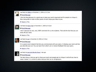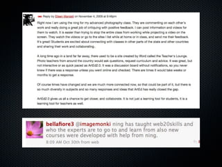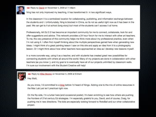 The document discusses the use of Ning as a social network platform for professional growth, collaboration, and community building in digital arts education. It highlights Ning's features that support educators in showcasing student talent, cultivating collaborative environments, and providing mentorship. Additionally, it emphasizes the platform's accessibility and compatibility with various devices.