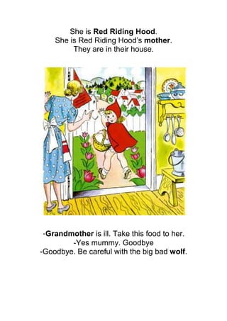 Little Red Riding Hood takes a basket of food and flowers to her sick grandmother's house, but encounters the big bad wolf along the way. The wolf beats Red Riding Hood to the grandmother's house and tricks her by pretending to be the grandmother. A hunter rescues Red Riding Hood and her grandmother from the wolf, and they are able to enjoy the food and flowers together safely.