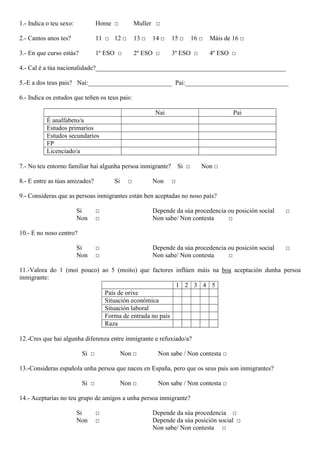 7.- No teu entorno familiar hai algunha persoa inmigrante? Si □ Non □