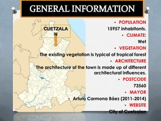 Cuetzalan has a population of 15,957 inhabitants and a wet climate. The town's vegetation consists of tropical forest plants and its architecture is made up of different influences. The postal code is 73560 and the current mayor is Arturo Carmona Báez, who has held the position since 2011. Additional information about Cuetzalan can be found on its city website and other tourism sites that feature the town's inclusion in Mexico's Pueblos Mágicos program.