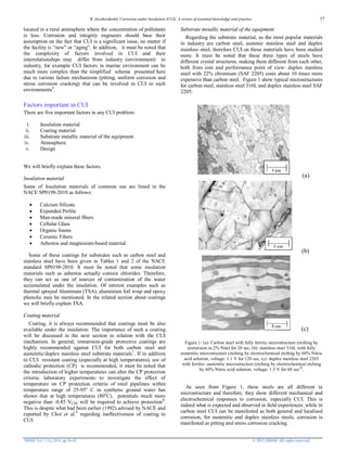 This document provides a review of corrosion under insulation (CUI), discussing key factors and mechanisms. It summarizes that CUI occurs via a three step process: 1) water ingress, 2) water accumulation under insulation, and 3) dissolution of corrosive species. Five important factors for CUI are discussed: insulation material, coating material, substrate material, atmosphere, and design. Carbon steel is susceptible to general and localized corrosion from CUI, while stainless steel risks pitting and stress corrosion cracking. Proper coating and design can prevent the water accumulation and corrosion processes that cause CUI.