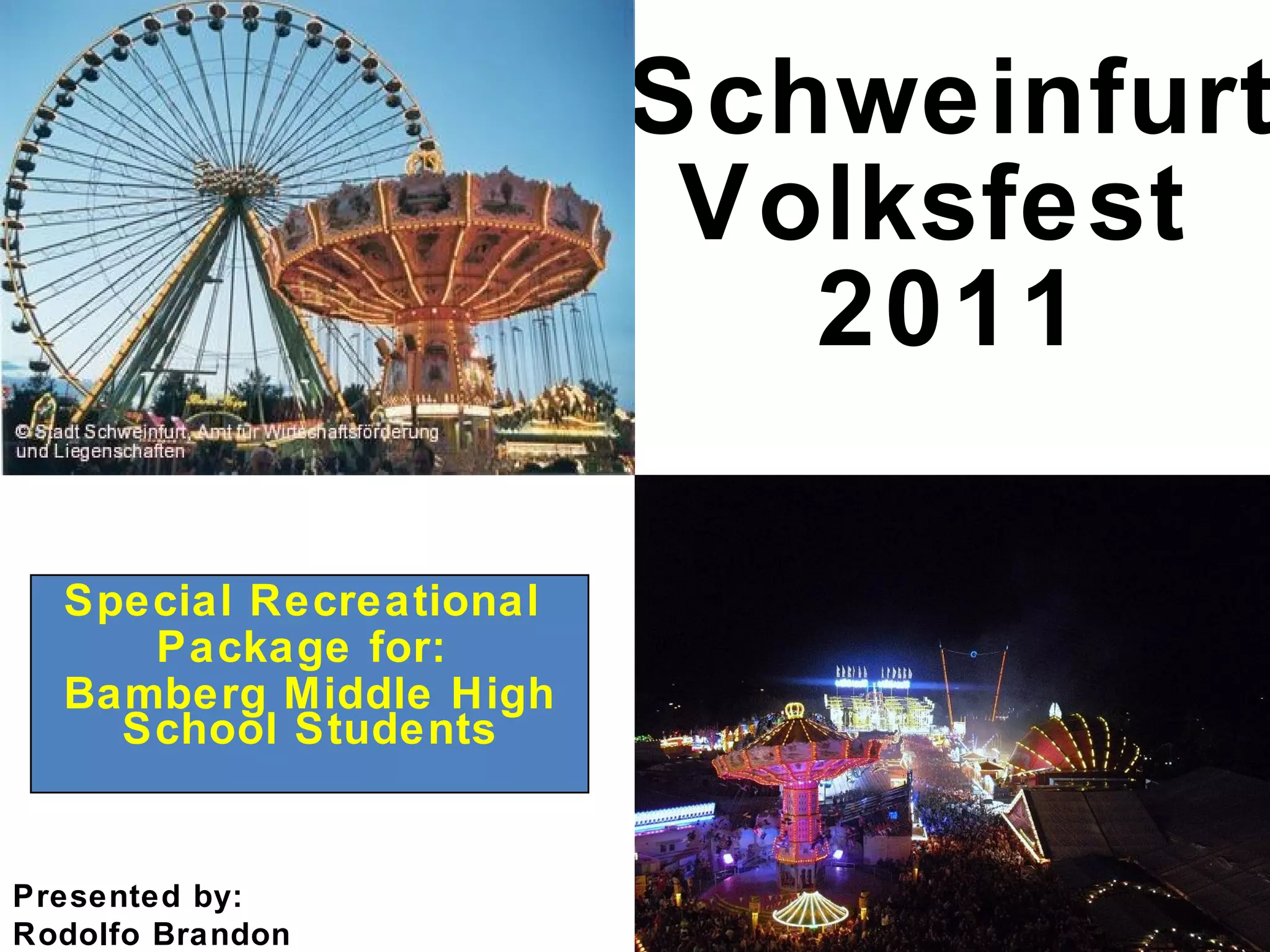 The document summarizes a recreational package for Bamberg Middle High School students to attend the Schweinfurt Volksfest in 2011. It details transportation options from Bamberg to Schweinfurt, lodging accommodations at the Bradley Inn or Kolping Hotel near the festival grounds, and activities included in the package such as rides, games, beer tents, and fireworks each night.