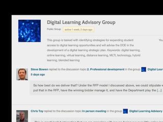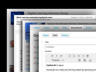Maine's Department of Education aims to cultivate collaboration through an online community of practice. The document discusses how initial collaboration from conferences and workshops decreases over time but sustained online collaboration can increase over the long term. It proposes online tools and resources managed by the Department of Education to facilitate ongoing collaboration among educators throughout Maine.
