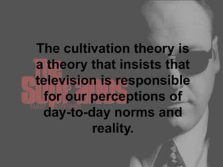 The cultivation theory proposes that television shapes viewers' perceptions of social reality. It suggests that heavy television viewers are more likely to see the real world as dangerous and violent due to the frequent depictions of crime and violence on television. However, critics argue that the theory has many flaws, as it fails to account for viewers' demographics and does not consider the influence of specific television shows versus television in general. There are also questions around whether surveys adequately assessed viewers' perceptions before television exposure. Overall, the document concludes the cultivation theory is not very promising due to its numerous weaknesses.