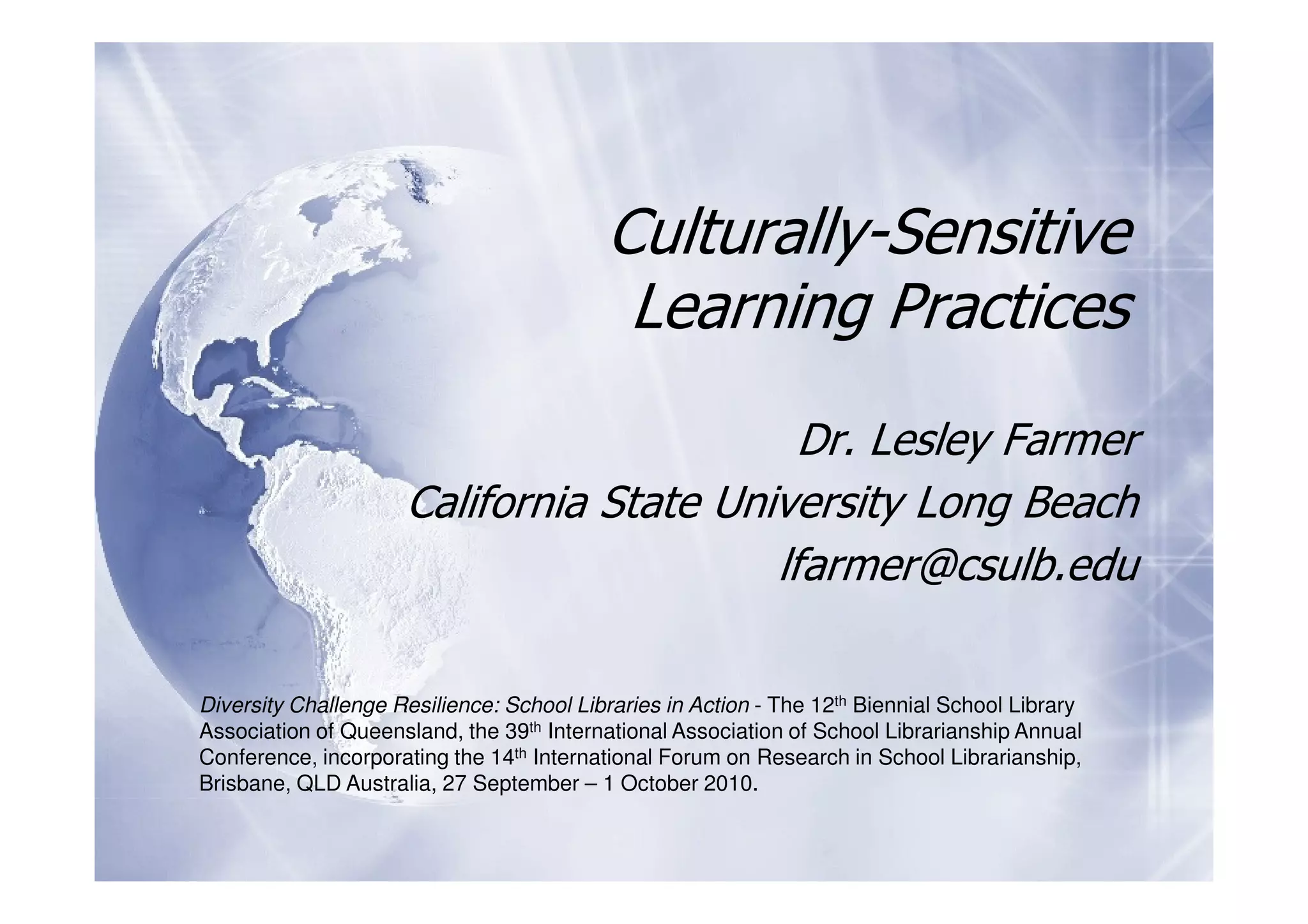 The document discusses culturally-sensitive learning practices in school libraries, emphasizing the importance of understanding cultural factors, language issues, and diverse teaching strategies. It highlights the need for cultural competence and proficiency among educators to effectively engage students and create inclusive learning environments. Future trends indicate a growing need for cultural integration and adaptation in educational practices, supported by technology and learner-centered approaches.