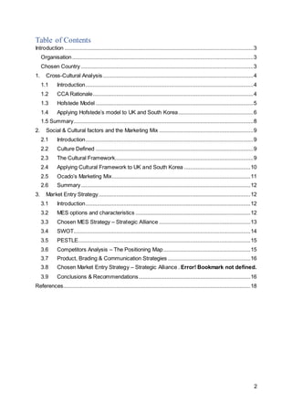 This document provides an analysis of Ocado entering the South Korean market. It begins with an introduction to Ocado and an explanation of why South Korea was chosen as the target market. It then performs a cross-cultural analysis of the UK and South Korea using Hofstede's cultural dimensions model to understand cultural differences. Finally, it proposes a market entry strategy for Ocado in South Korea, analyzing factors like SWOT, PESTLE, competitors and recommending product, branding and communication strategies. The overall aim is to evaluate how social and cultural factors influence consumer behavior and develop an appropriate marketing approach for Ocado's expansion.