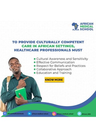 To provide culturally competent care in African settings, healthcare professionals must: 1. Cultural Awareness and Sensitivity 2. Effective Communication 3. Respect for Beliefs and Practices 4. Collaborative Approach 5. Education and Training
