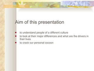 This document provides an overview of cultural competency and discusses some key cultural characteristics and customs of various ethnic groups, including Latin Americans, Asians, Indians, Chinese, Middle Easterners, Japanese, and others. It emphasizes the importance of understanding cultural differences in communication styles, business practices, etiquette, and traditions in order to effectively interact with people from diverse cultures.