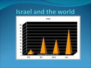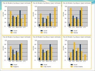 The document discusses Geert Hofstede's research on cultural dimensions and provides information on how several countries score on Hofstede's indices of Power Distance, Individualism, Masculinity, Uncertainty Avoidance, and Long Term Orientation. Specific details are given on the cultural dimension scores and characteristics of Israel, the Arab World, China, India, and the United States.