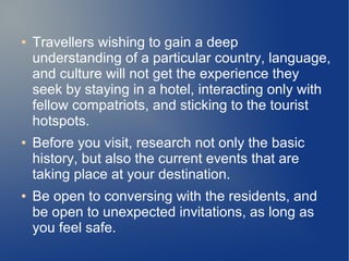 To gain a deep understanding of a culture while traveling abroad, one should interact with local residents rather than other tourists, learn some of the language even if it's difficult, and join local community groups. They should also research current events, be open to new experiences, and avoid forming stereotypes about the people or place.
