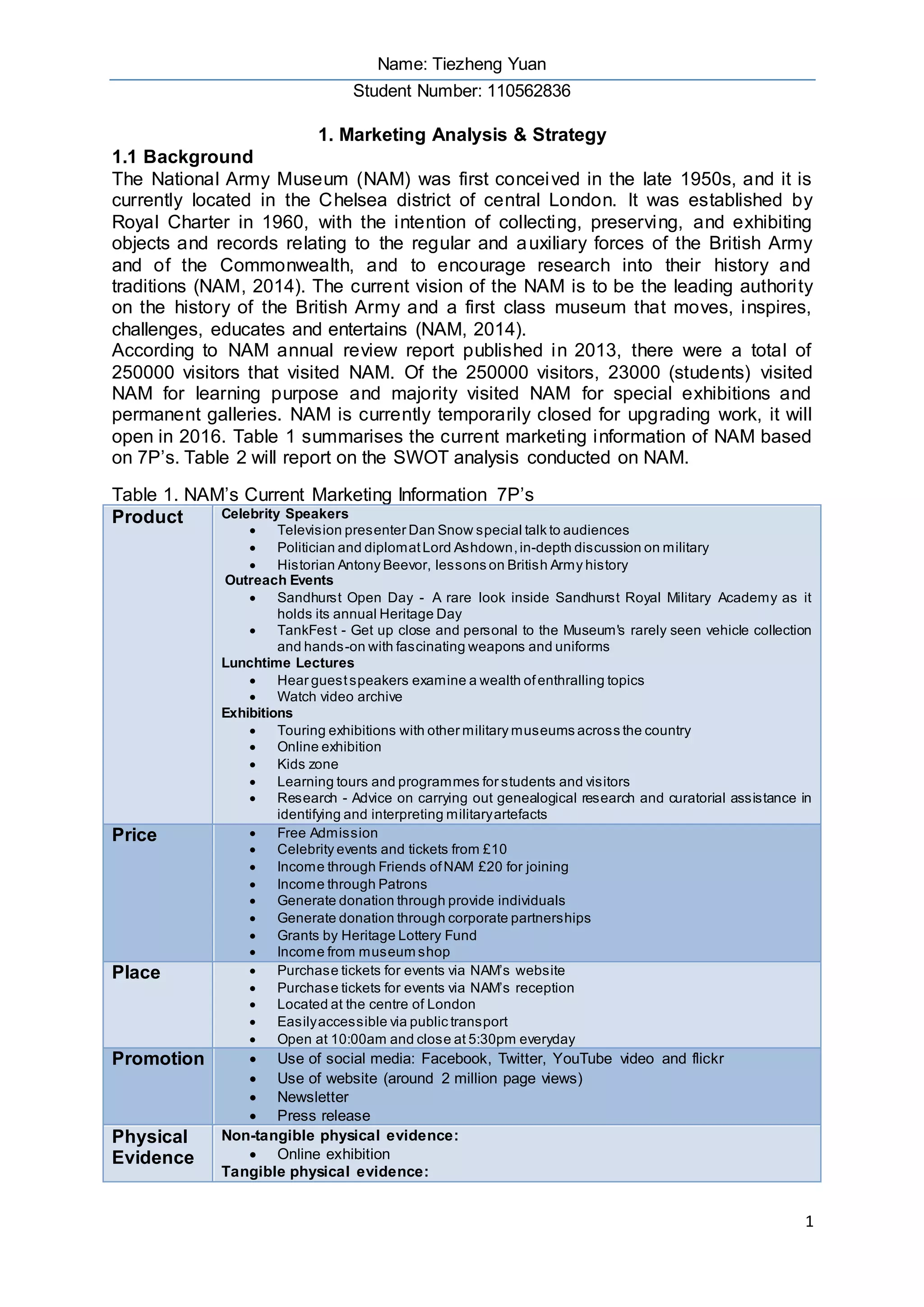 The document is a marketing analysis and strategy report for the National Army Museum (NAM) in London. It provides background information on NAM, analyzes its current marketing using the 7Ps framework, identifies stakeholders, and sets objectives to increase visitor numbers. Recommendations are made to enhance NAM's product offerings through interactive experiences like a scavenger hunt and storytelling for children. Pricing strategies suggested include maintaining free general admission while implementing a tiered patron program to generate additional income.