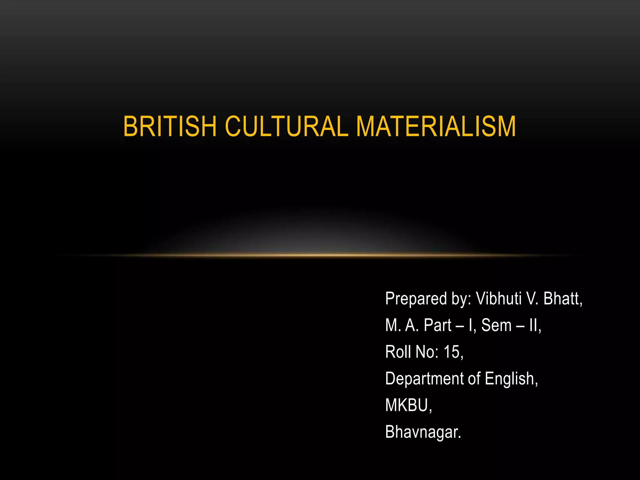 This document discusses British cultural materialism, an approach to cultural studies that began in the 1950s. It examines culture from two perspectives - looking back to the past or toward the future. Key figures discussed include Matthew Arnold, Raymond Williams, and F.R. Leavis, who promoted improving the moral sensibilities of wider readers. Influential thinkers referenced Marxist concepts like classless society and cultural hegemony from thinkers like Gramsci, exploring how domination is not always visible.
