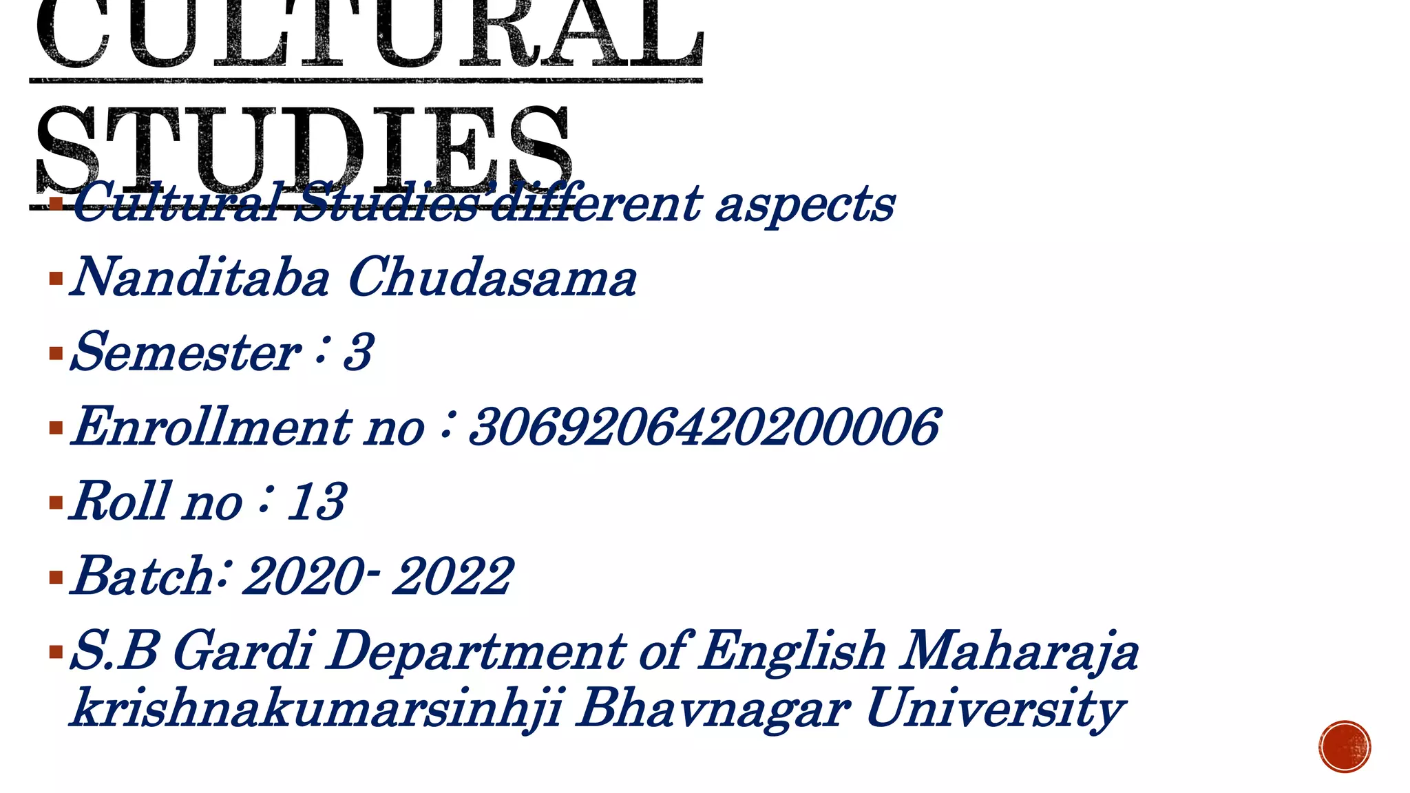 This document provides an overview of cultural studies. It defines cultural studies as a field that analyzes culture and its relationship to power structures through a theoretical and political lens. It examines how cultural practices relate to issues like class, gender, and globalization. The document also discusses some key concepts in cultural studies, like its use of the concept of "text" to analyze various cultural artifacts, and its focus on everyday cultural sites. It lists some characteristics of cultural studies, such as its aim to understand culture in context and reconcile divisions of knowledge.