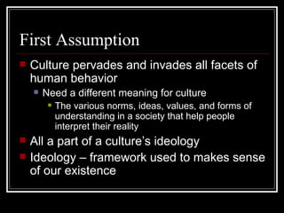 This document discusses key concepts in cultural studies such as culture, ideology, hegemony, and counter-hegemony. It defines culture as the norms, values, and understandings that help people make sense of their reality. Ideology refers to the framework people use to understand existence. Hegemony is the dominance of one social group over others through influencing ideas and beliefs. Counter-hegemony involves using hegemonic behaviors to challenge domination. The document asks if there are beliefs not influenced by the dominant culture, and if so, where they originated.
