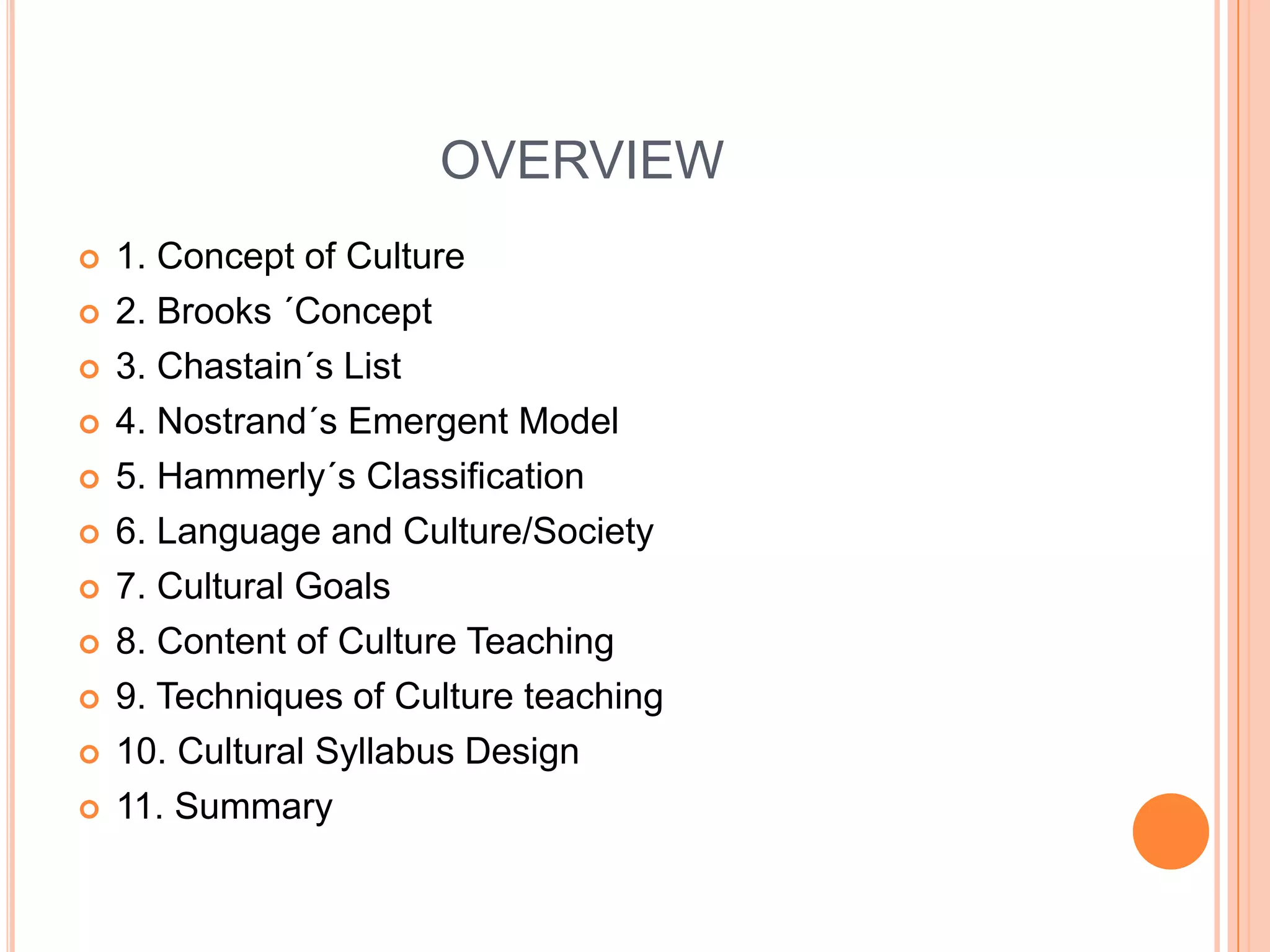 This document discusses different approaches to teaching culture as part of language education. It outlines Brooks' concept of teaching "deep culture" through everyday topics. It also describes Chastain's list of cultural topics, Nostrand's model of organizing cultural observations under broad themes, and Hammerly's three-fold classification combining factual and behavioral culture. The relationship between language and culture is explored, along with goals for developing cultural skills in learners. Content areas and techniques for teaching culture are identified, and challenges of cultural syllabus design are noted.