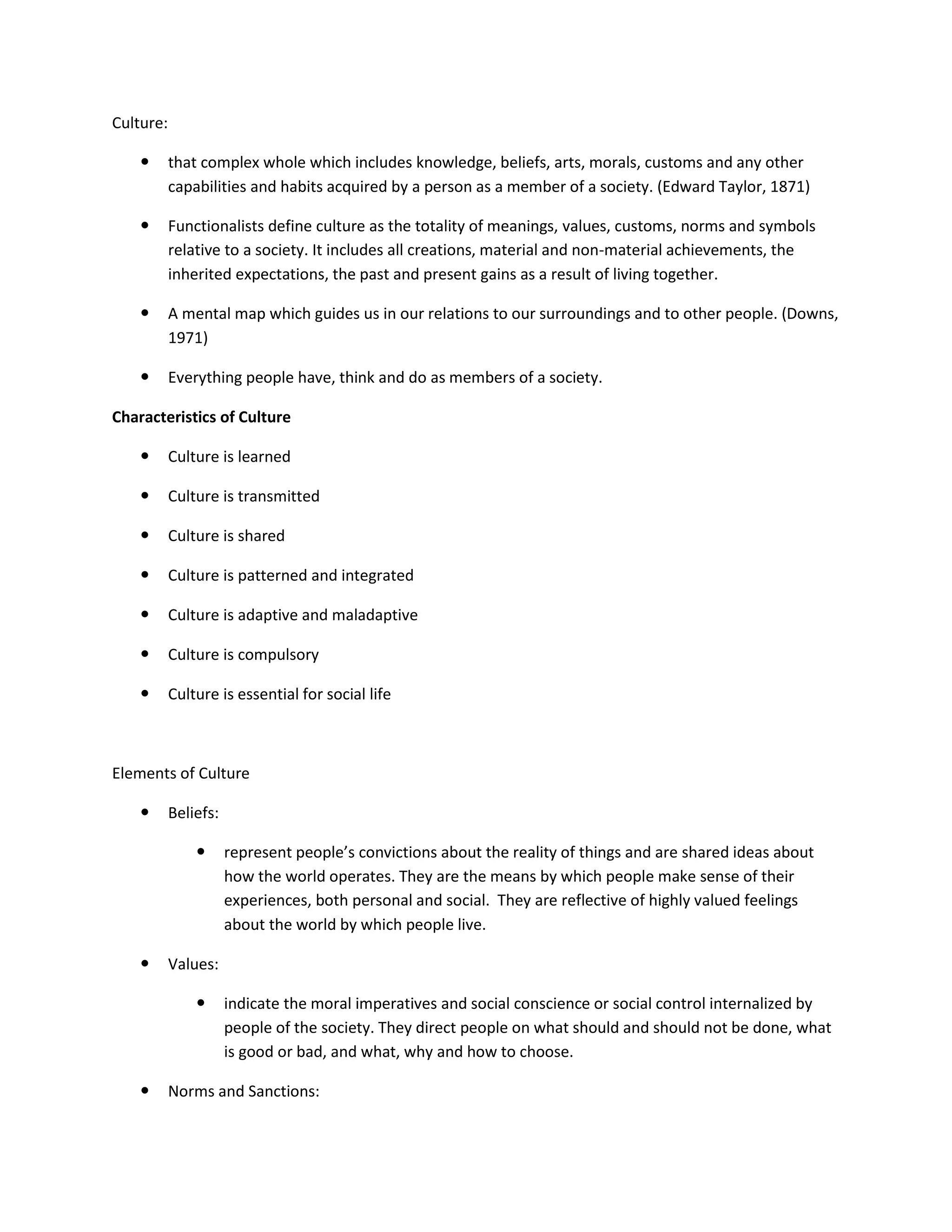 The document defines culture and its key characteristics. It discusses the main elements of culture including beliefs, values, norms, sanctions, and material culture. It also examines the relationship between culture and society. Culture is learned, transmitted, shared, patterned, and adaptive. It is comprised of ideas, beliefs, values, norms, languages, and material objects. Societies are made up of social institutions that fulfill important functions. The document then focuses on analyzing Philippine culture and values, emphasizing the central role of family and concepts like utang na loob, pakikisama, and bahala na.